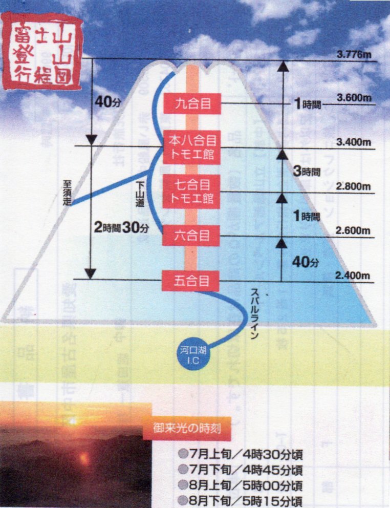 富士山五合目・富士急雲上閣14:30〜15:30・・・7/8号目・山小屋/仮眠・23:00-24:00・・・山頂・ご来光&朝食・・五合目