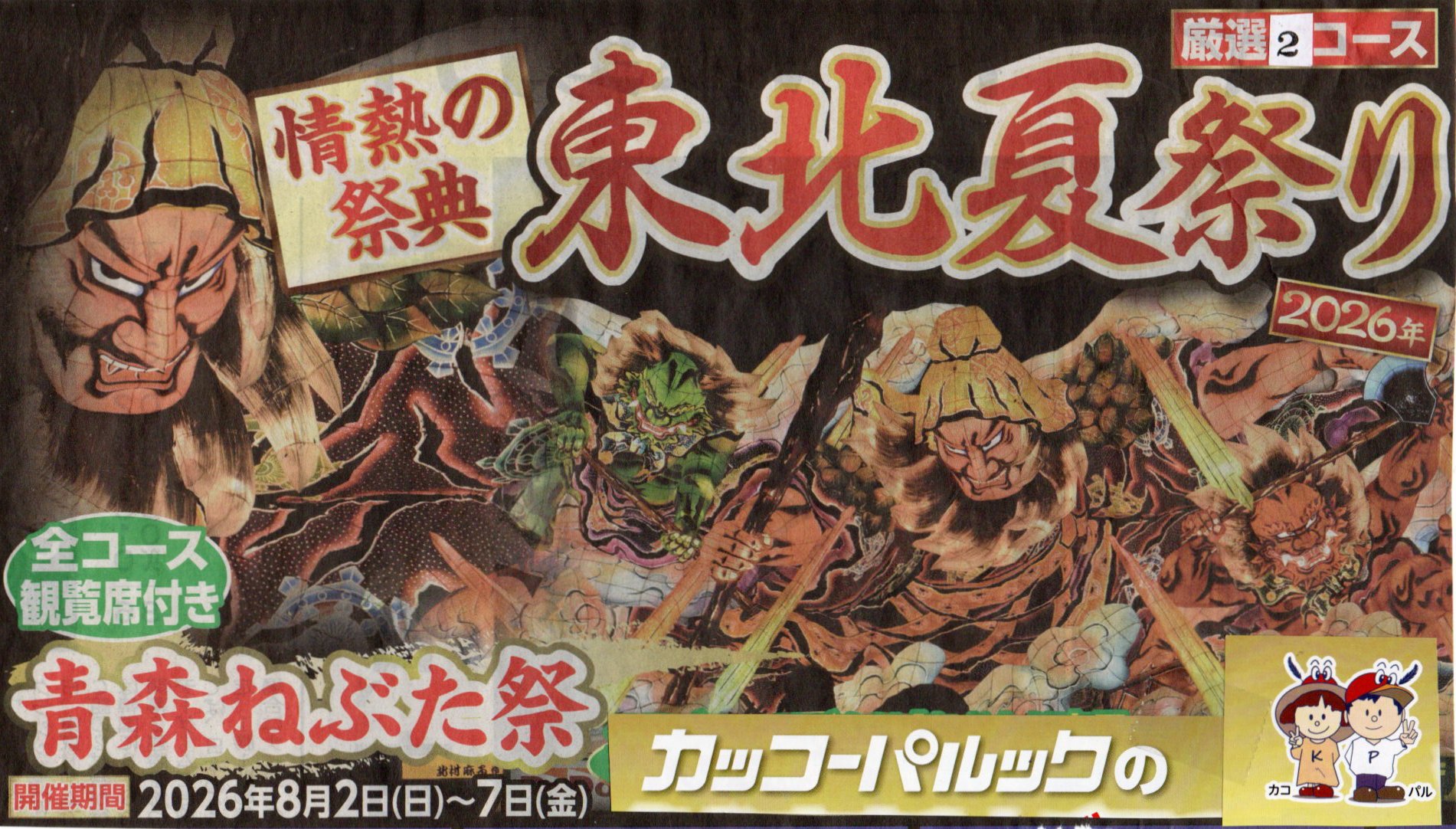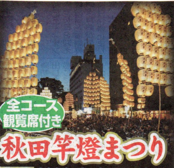 | 出発日:8月4日(火)・ 行程:①名古屋空港12:20→FDA→山形空港ー秋田竿灯まつり/観覧席ー新鉛温泉/泊 ②弘前城ー青森ねぶたまつり/観覧席ー八甲田/泊 ③奥入瀬渓流・城ケ倉大橋ー青森空港→FDA→名古屋空港20:15 料金:2名1室・210,000円・3歳~小人同額 |