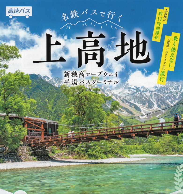 | 期日:6/9.20.25.7/4.13.26.30.8/2.16.27 集合:名駅西口 9:20 宿泊:奥飛騨ガーデンホテル焼岳・会席料理 行程:①上高地散策ー奥飛騨温泉/泊 ②ゆっくり出発11:00or新穂高ロープウェイ鑑賞/自己負担ー乗鞍スカイライン畳平散策ー高山土産店ー ー名駅西口18:10