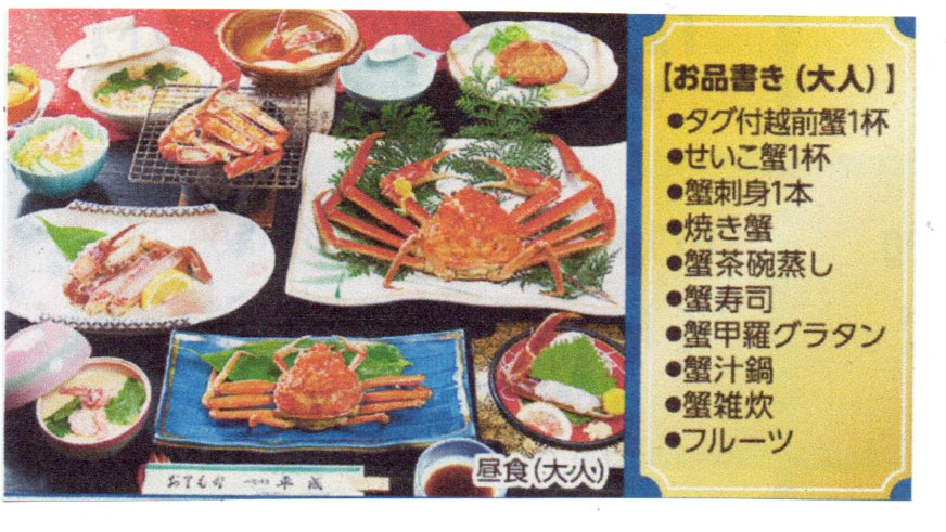 | 期日:I11/10.18.26.12/4.12.20.1/5.13.29.2/1.17.25 .J11/21.12/22.1/21.2/9.19 出発保証日:11/10.26.12/20.2/1 集合:I名駅西口8:20 J鳴海7:25→徳重→赤池8:10 行程:小牧かまぼこー料理旅館「平成」他/昼食・蟹会席11品ー道の駅「越前」 ー越前そばの里-I名駅西口17:20・J赤池17:50〜各地 旅行代金:25,000円・小人メニュー8,000円引 【参考】 第一(火)は道の駅「越前たけふ」へ変更・店内で釜茹で蟹賞味 |