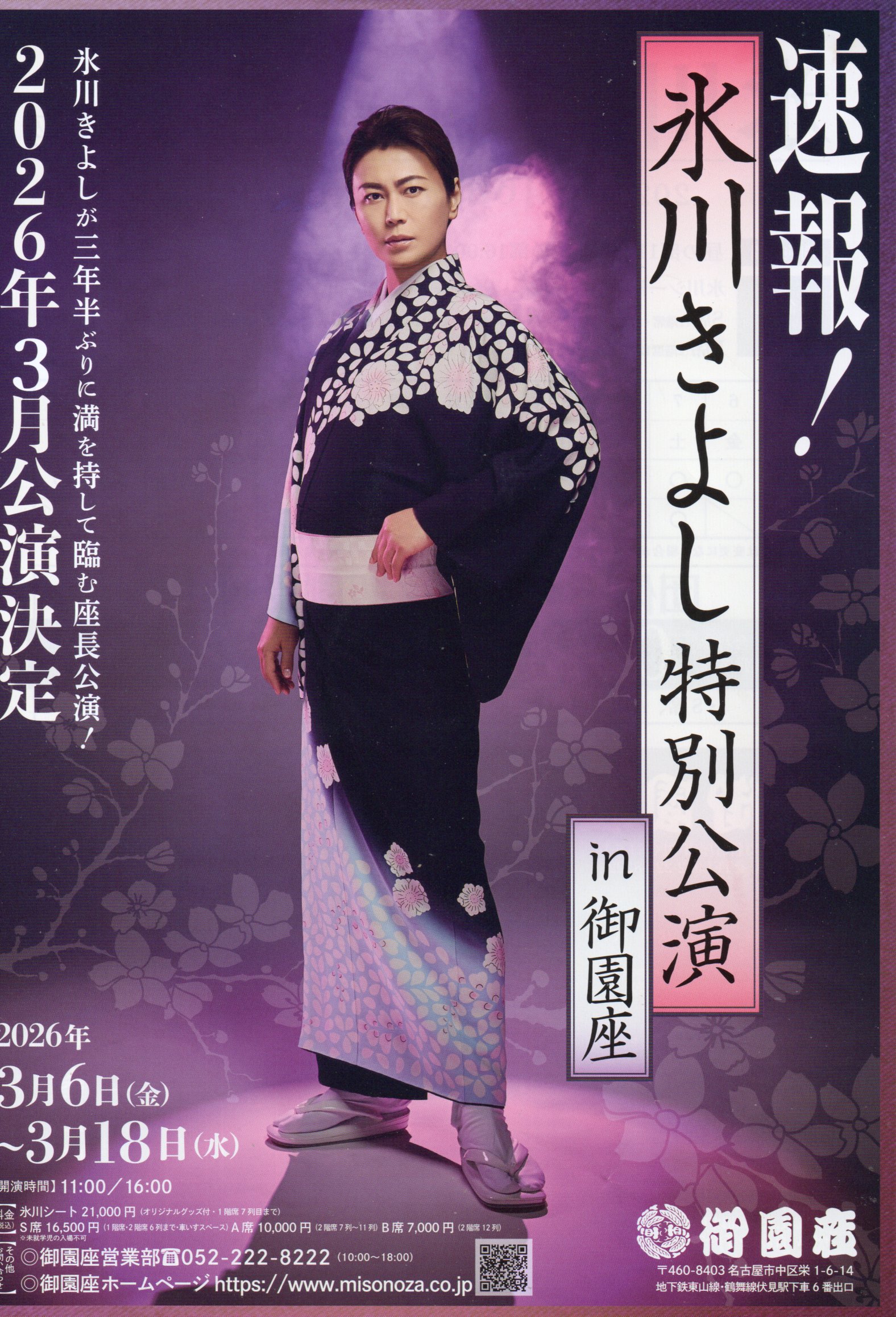 □氷川きよし特別公演 期日:3月6日(金)〜18日(水) 公演:1部・新作時代劇。2部・氷川きよしコンサート2026 開演:11:00→3/6-8.12.14.15.18・16:00→3/7.14 料金:氷川シート21,000円・S席16,500円・A席10,000円・B席7,000円 発売日:1/20・発売開始・・ 事前受付中・・・・未就学児童不可 |