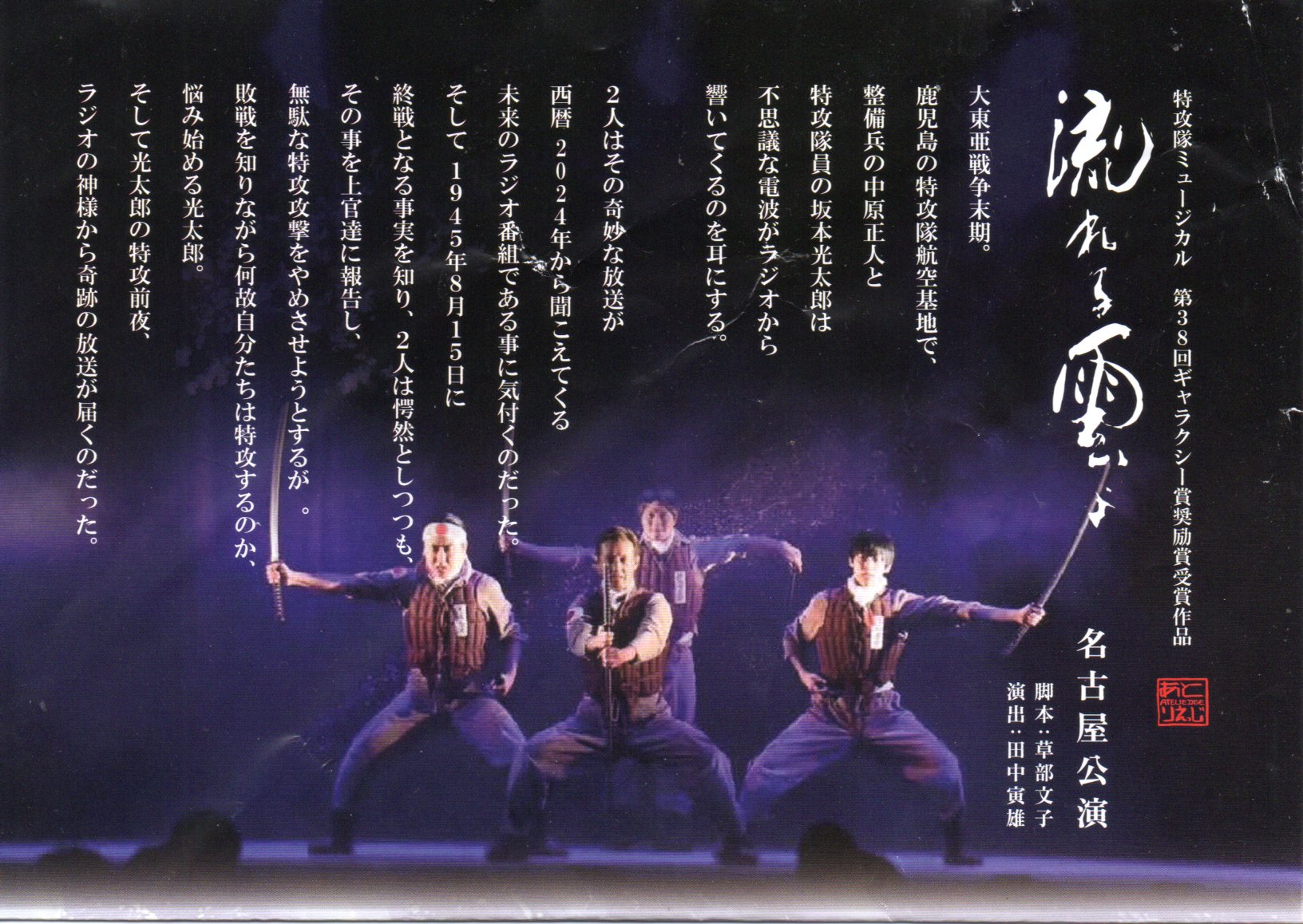 特攻隊ミュージカル・第38回ギャラクシー賞受賞作品 期日:10月4日(土)・5日(日) 会場:ウインクあいち・大ホール・JR名古屋駅徒歩3分 開演:10/4→18:30・10/5→11:30A15:30 料金:前売券4,500円・当日券5,000円・学生無料/事前予約制 一般発売日:好評発売中・・・・・ |