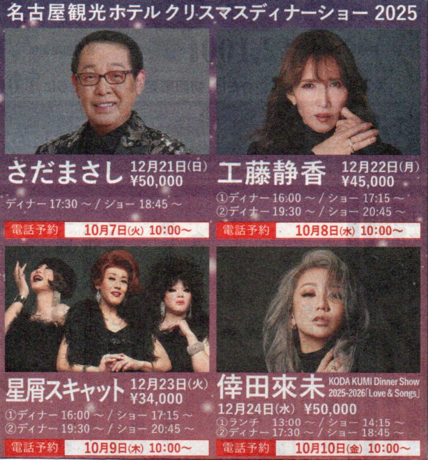 期日:12月24日(水) 会場:名古屋東急ホテル・ヴェルサイユ 開演:ディナー17:30・ショー18:50〜 料金:全席指定 32,000円・洋食フルコース・飲み物付 好評発売中 |