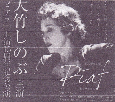 | □上演15周年記念「ピアフ」 期日:2月6日(金)〜8日(日) 出演:大竹しのぶ・他 開演:13:00→2/7.8・15:00→2/6 料金:全席13,800円・未就学児童不可 発売日:11/1・発売開始・・ 事前受付中・・・ |