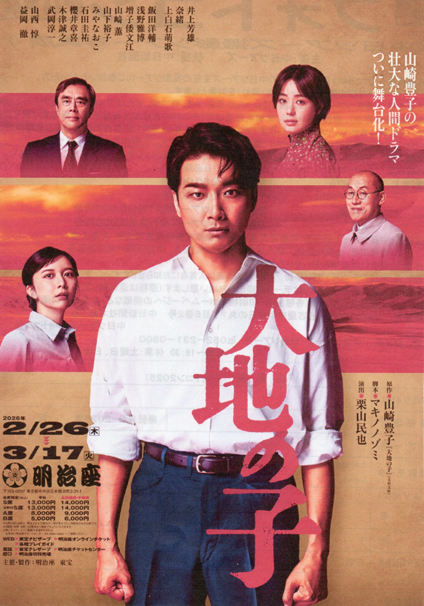 | □大地の子 山崎豊子の壮大な人間ドラマ 期日:2/26(木)〜3/17(火) 出演:井上芳雄・他 開演:12:00→2/28.3/7.8.15.13:00→3/2.4.9-11.16.17.17:00→2/28.3/7.14.18:00→2/26.27.3/4.9.11.16